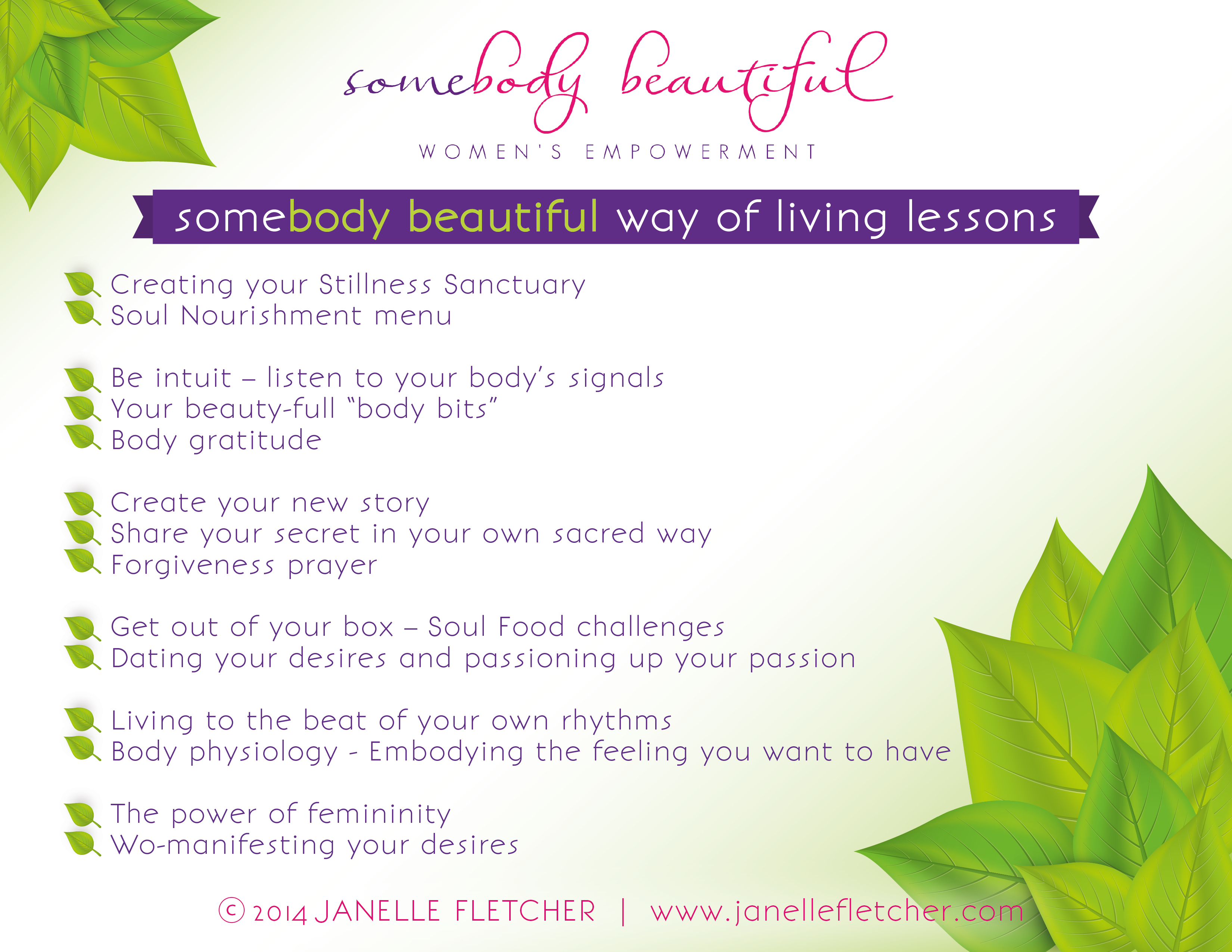Jump on the someBODY BEAUTIFUL facebook community or send in your feedback comments, thoughts, progress and ‘magic moments’ to me at janelle@janellefletcher.com or on www.janellefletcher.com